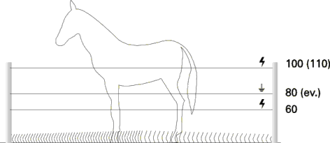 | Hästar är väl det djur som är vanligast att stänga inne med el. Lika många hästägare som det finns i Sverige, lika många olika synpunkter finns det på stängslingen. Man hör alltid att på det ena eller andra materialet har jag hört eller sett hästar som skadat sig. Det spelar nästan istörre roll vad man har för material när det hänger och slappar mellan stolparna. Kommer då hästarna för nära så är risken mycket stor att de snärjer in sig i tråden och skadar sig. Ha därför alltid tråden sträckt! Vad det gäller trådhöjden så beror det på vad det är för häst, en mindre ras kan ju ha lägre trådhöjd. Vad det gäller spänningen så behöver man inte så kraftig då dessa för det mesta är jordade med järnskor i marken. De är också ganska känsliga för ström. Shettlandsponnys och Islandshästar behöver i regel kraftigare spänning i tråden då dessa är bättre isolerade genom sin tjockare päls. Det är inte några problem ej heller farligt att ha det starkaste aggregatet för några djur. Man skall inte heller ha den visionen att min häst är så rädd för elstängsel att det räcker att sätta upp en tråd utan ström. Hästarna känner på ett avstånd från tråden om det är spänning i den eller inte. Har man det då spänningslöst så har man snart en rymmare, vi har en sådan häst. Man bör heller inte bara ha en tråd som är ganska vanligt, för går då djuret och betar under tråden och blir den då störd så reser den på huvudet och får tråden på manken och springer rätt ut i panik. Man behöver inte heller ha tråden onödigt högt för hästar hoppar ogärna över elstängsel. Skissen nedan visar vad jag tycker är rekommenderbar trådhöjd (i cm). Skissen visar också vad jag tycker att man skall ha jordningen i stängslet om man använder jordning i stängslet. Se i ett annat kapitel om jordproblem. |