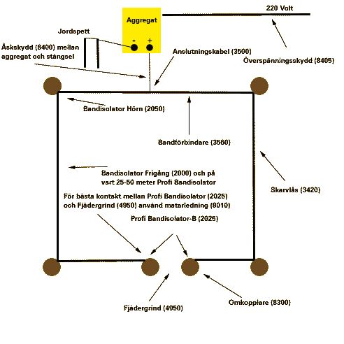 | Skissen ovan visar de flesta tillbehören för ett stängsel med band. Principen är den samma för både elrep och tråd. |